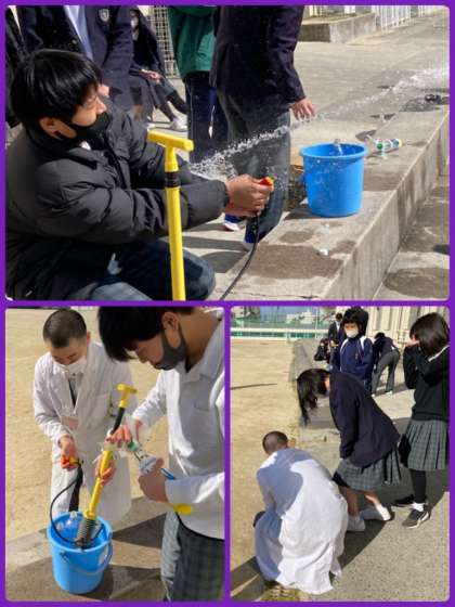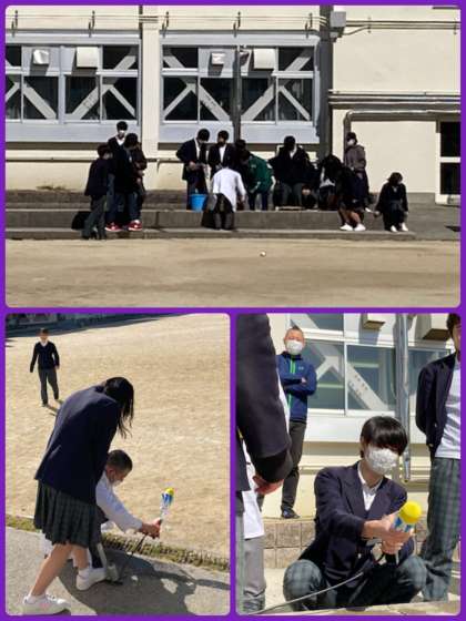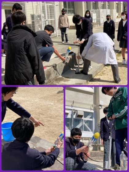 9年生は理科で、ペットボトルロケットを飛ばしました。よく飛ぶ角度を考えながら空気を入れていきました。みんなで協力しながら、童心に帰ったような無邪気な表情で楽しく学んでいる姿が見られました。