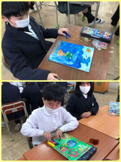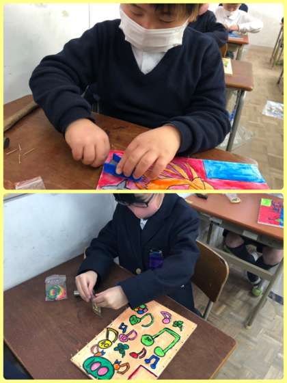 3年生は図工で、コリントゲームを作りました。どこにくぎを打ったら楽しめるか考えながら、それぞれが工夫して進めていきました。様々なしかけがほどこされたオリジナルの作品ができ上がりました。ぜひ、ご家族でも楽しんでみてください。