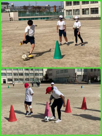 6年生は、体育でサッカーをしました。チームごとに、シュートやドリブル、パスなど、色んなパターンの練習を重ねていきました。サッカーを習っている子からの的確なアドバイスもあり、お互いに高め合うこともできました。
