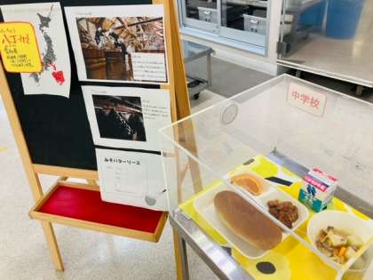 3月17日の献立は「鶏肉のみそバターソース、スープ煮、デコポン、黒糖パン、牛乳」でした。鶏肉のみそバターソースには【八丁みそ】が使われていました。