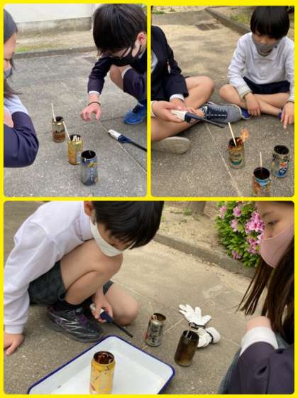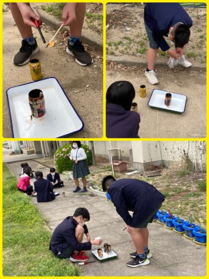 6年生は理科の実験で、よく燃える燃え方と空気の動きの関係を調べました。それぞれがたてた予想と照らし合わせながら、安全に気をつけてのぞみました。前年度取り組んだ飯ごう炊さんの場面を思い出して、予想をたてていた児童もいました。この日学んだことも、日常生活に活かせられるといいですね。