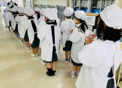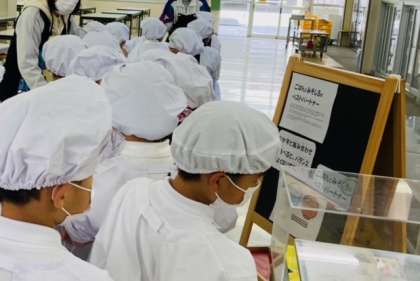 (中・下)1年生が給食室に来た時のようすです。サンプルケースをよく見たあと、こころを込めて「1年生です。いただきます。」しています。