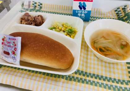 今日の献立は「豚肉のデミグラスソース、スープ、キャベツとコーンのソテー、コッペパン、いちごジャム、牛乳」でした。