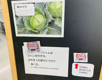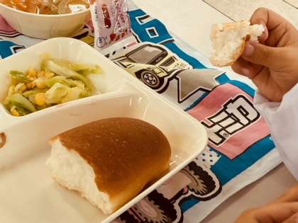 1年生は、初めてのジャム(袋もの)にチャレンジ。お話をよく聞いて、上手にパンをちぎり、ジャムをつけて食べていました。