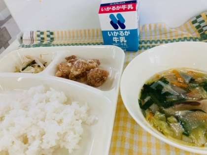 今日の献立は「鶏肉のからあげ、中華スープ、チンゲンサイともやしの甘酢あえ、ごはん、牛乳」でした。
