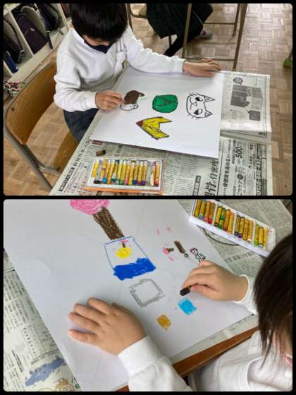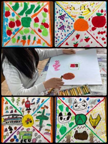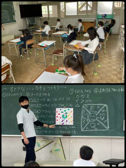 2年生は図工の学習で、世界に一つだけのオリジナルハンカチを描きました。自分のマークを決めて、テーマに基づいた絵を描いて、まわりは模様で飾っていきました。動物、乗り物、野菜、果物など、各自のテーマで丁寧に描いていきました。かわいくて立派なハンカチができ上がりました。