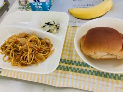 今日の献立は「カレースパゲッティ、キャベツのひじきドレッシング、バナナ、1/2黒糖パン、牛乳」でした。バナナの箱の