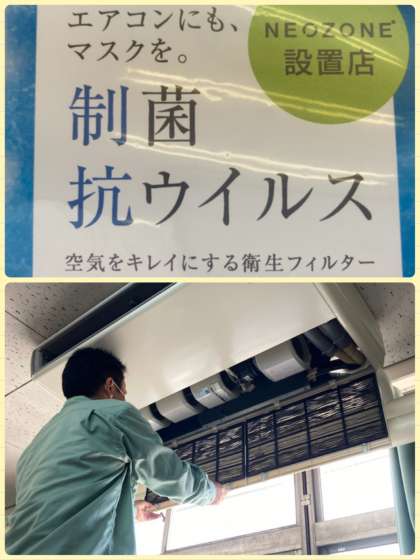 管理作業員さんにお願いして、エアコンのフィルターに、空気をきれいにする衛生フィルターを取りつけてもらいました。ウイルスやホコリ、ニオイも抑制できます。