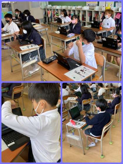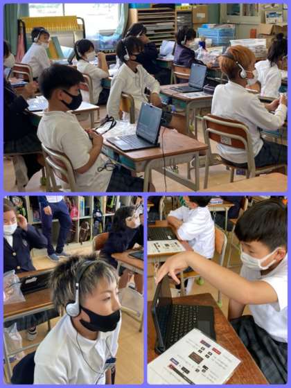 4年生は今週の木曜日に、1人1台学習者用端末を家庭に持ち帰り、双方向通信を行います。先日クラスで、自分の家にいると想定してヘッドフォンを装着し、機器のつなげ方等の練習をしました。