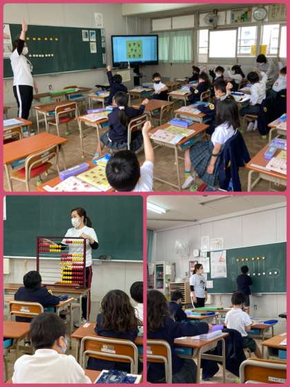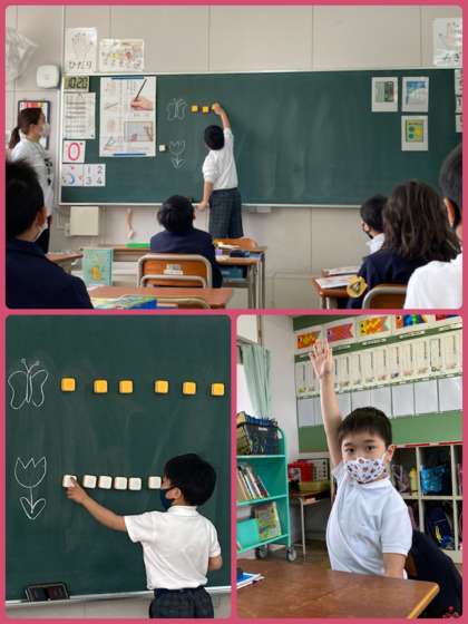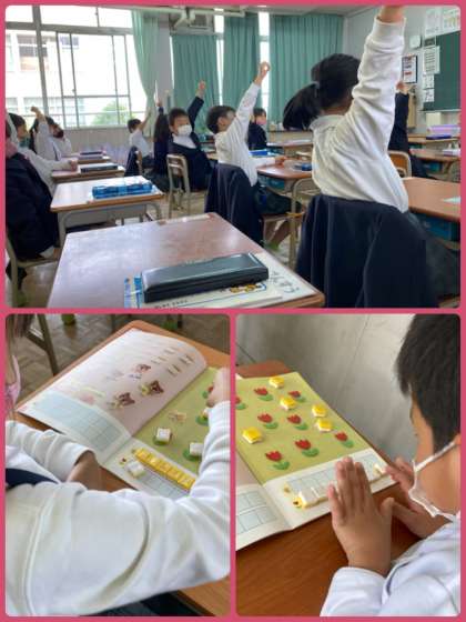 1年生は算数で、10のかたまりを意識しながら学習を進めています。ブロックや百玉そろばんなども使いながら、理解を深められるようにしています。これからたし算やひき算の基礎になる考え方を、しっかりと身につけておきましょう。