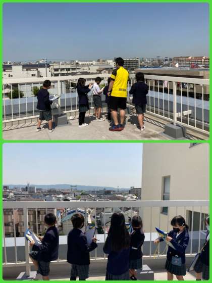 3年生は社会の学習で、自分たちの住んでいる町の様子を調べるために、学校の屋上に上がって観察しました。はじめに方位磁針を使いながら、それぞれの方位に何が見えるかをワークシートに書きこんでいきました。