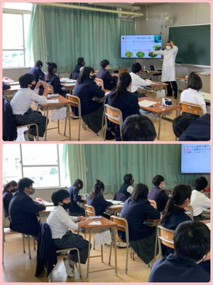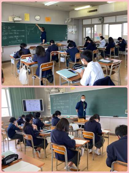 7年生の教室をのぞいてみると、1組は社会、2組は理科の学習をしていました。地理分野の日本とハワイの時差を考える問題には、それぞれの経度による計算間違いに気をつけてのぞみました。理科では、植物の葉の共通点と相違点をだして分類していきました。