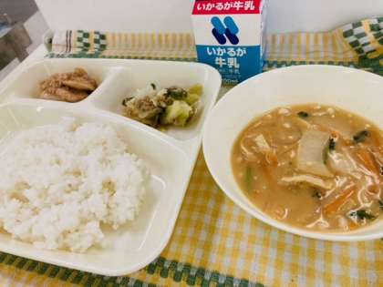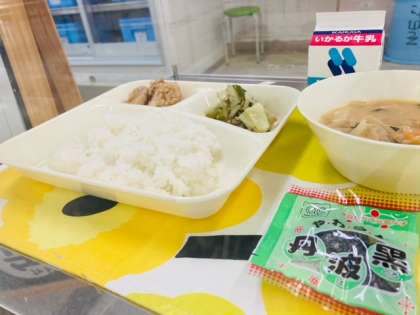今日の献立は「鶏肉のおろしじょうゆかけ、みそ汁、野菜いため、ごはん、牛乳、中学校:ソフト黒豆」でした。