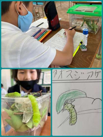 3年生は、アオスジアゲハ蝶を幼虫から育てています。幼虫から脱皮し、さなぎになる様子まで成長の様子を観察しながら育てています。すでに1匹、蝶になりました。みんな順調に大きくなっていってほしいですね。
