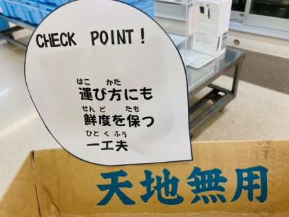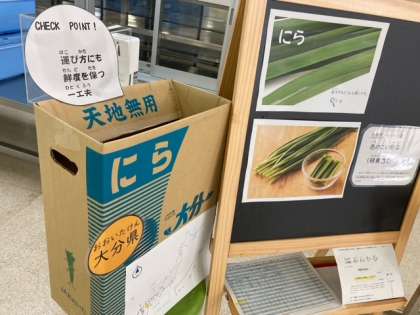 今日のにらは、大分県産でした。めずらしく縦型の段ボールで届いていました。運び方にも鮮度を保つ一工夫があり、生産者のおいしく食べてほしいという気持ちを感じました。段ボールには「天地無用」の文字があり、四字熟語の勉強にもなりました。