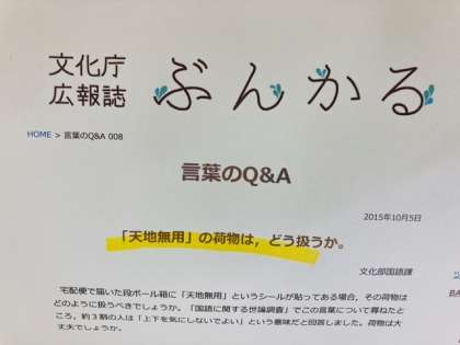 宅配便で届いた段ボール箱に「天地無用」というシールが貼ってある場合,その荷物はどのように扱うべきでしょうか。「国語に関する世論調査」でこの言葉について尋ねたところ,約3割の人は「上下を気にしないでよい」という意味だと回答しました。荷物は大丈夫でしょうか。