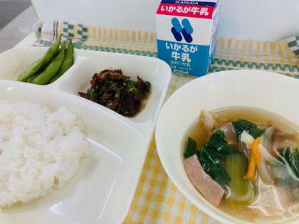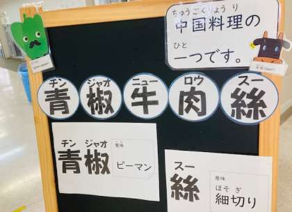 今日の献立は「チンジャオニューロウスー、ハムと野菜の中華スープ、えだまめ、ごはん、牛乳」でした。チンジャオニューロウスーは、ピーマンと牛肉を細く切って炒めた中国料理です。中国語で【青椒牛肉絲】と書きます。