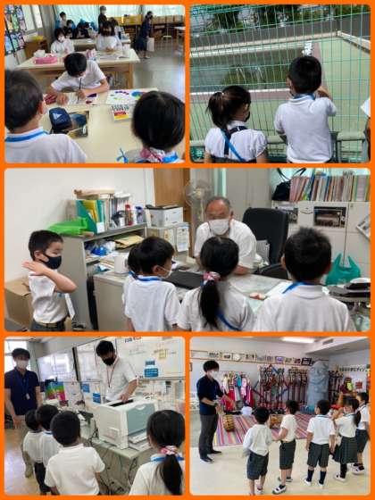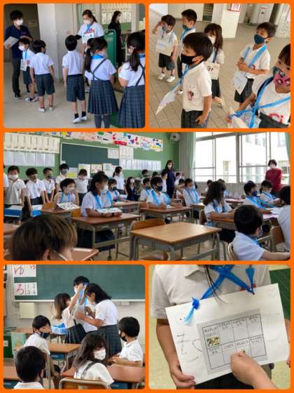 1年生は、学校の様々な場所を探検し、2年生に説明してもらいました。これから毎日過ごしていく広い校舎です。各場所の名前と行き方を、はやく覚えられるといいですね。2年生にポイントシールも貼ってもらい、うれしそうでした。職員室や校長室にも入れたのは思い出になりますね。