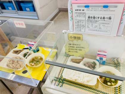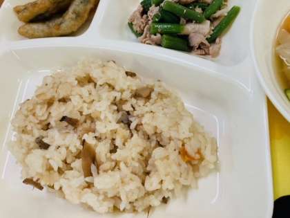 今日の献立は「いわしてんぷら、五目汁、豚肉とさんどまめのいためもの、ごはん、【中学校】かやくご飯、牛乳」でした。令和3年度より中学校において、年間6回程度を目途に、炊飯業者で調理されたかやくご飯や菜飯等の炊き込みご飯が提供されます。