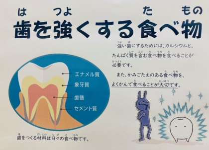 強い歯にするためには、カルシウムとたんぱく質を含む食べ物を食べることが必要です。また、かみごたえのある食べ物を、よくかんで食べることが大切です。