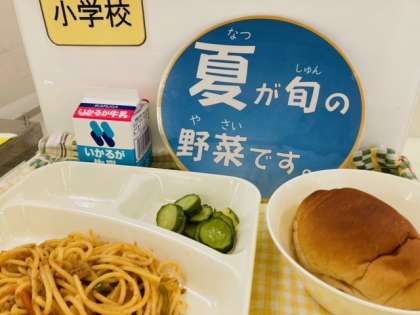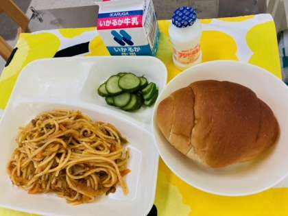 今日の献立は「スパゲッティミートソース、きゅうりのピクルス、1/2黒糖パン、牛乳、中学校:発酵乳」でした。