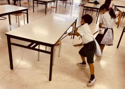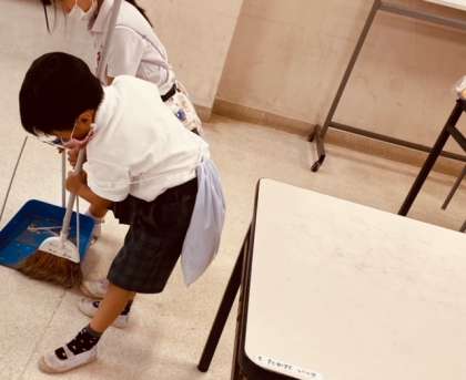 (下)ほうきとちりとり。少し角度をつけたり、力加減を調節したり。工夫しています!
