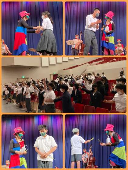 6〜9年生の、音楽鑑賞会を行いました。事前学習で、登場する楽器についてクラスで理解を深めてからのぞみました。学年代表の指揮者体験コーナーや、先生たちの代表もステージにあがって演じるコーナーなど、バラエティに富んだプログラムを組んでいただき、大いに盛り上がりました。