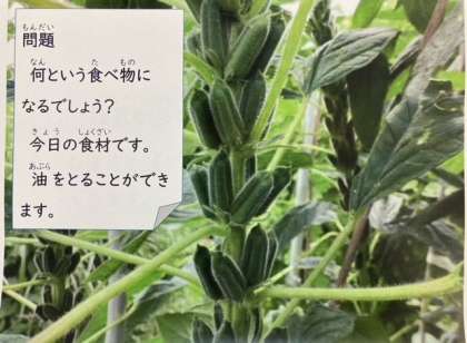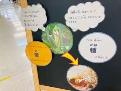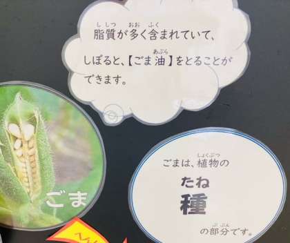 ごまは、植物の種の部分です。脂質が多く含まれていて、しぼると【ごま油】をとることができます。おもにエネルギーのもとになる黄のなかまの食べ物です。