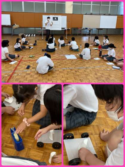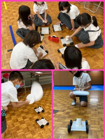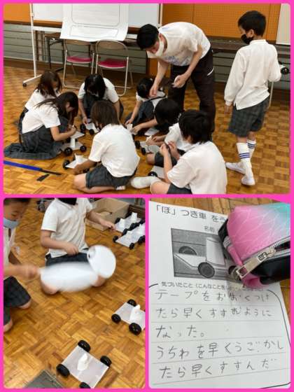 3年生は理科で、「ほ」つき車を作って、うちわであおぎながら動かしました。セロテープの貼り方なども工夫して、紙コップの「ほ」を固定させました。実験後、もっと速く進むためにはどうすればよいか、みんなで意見を出し合い、次の学びへとつなげることもできました。