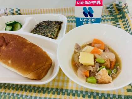 7/5の献立は「もずく入りヒラヤーチー、豚肉とあつあげの煮もの、あっさりきゅうり、おさつパン、牛乳」でした。ヒラヤーチーは沖縄の家庭料理の一つです。沖縄の方言で「ヒラ」には「平たく」、「ヤーチー」には「焼き」という意味があります。