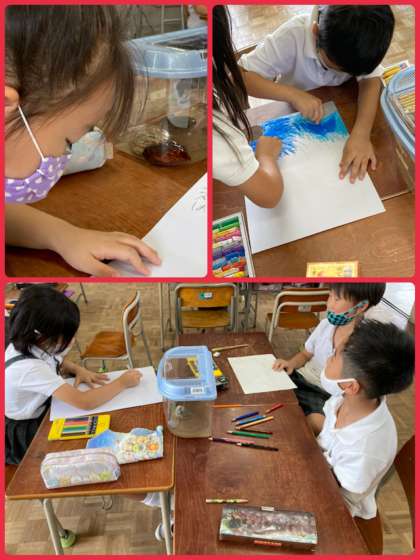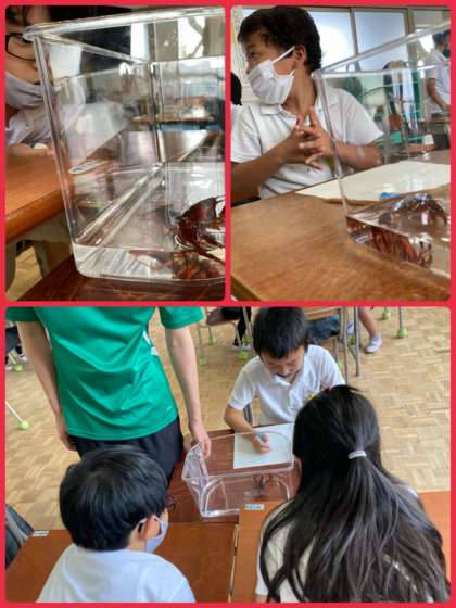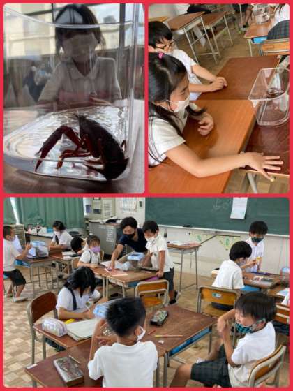 2年生は、クラスでザリガニを飼育しています。名前をつけたり、じっくり見て観察したり、愛着をもって世話をしています。今後の図工の学習で、画用紙に大きなザリガニの絵を描いていく予定です。楽しみにしておいてください。