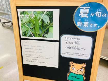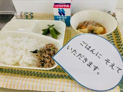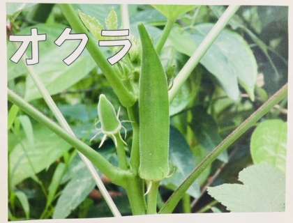 今日の献立は「豚肉とじゃがいもの煮もの、オクラの梅風味、ツナっ葉いため、ごはん、牛乳」でした。オクラは切り口が星のような形をしたものがよく使われていますが、丸い形のものもあります。オクラをきざむと出てくるネバネバには、腸の働きをよくしたり、胃の粘膜を守ったりする食物せんいが多く含まれています。