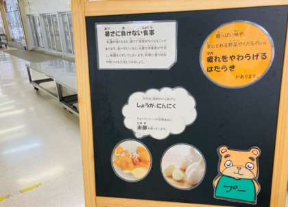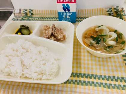 今日の献立は「鶏肉のからあげ、中華みそスープ、きゅうりとコーンの甘酢あえ、ごはん、牛乳」でした。気温が高くなると、暑さで食欲がなくなることがあります。食べずにいると必要な栄養素が不足し体調をくずしてしまいます。香辛料や香味野菜、酸味のある食べ物やくだものなど材料や味つけを工夫して、しっかりと食べて夏を元気に過ごしましょう。