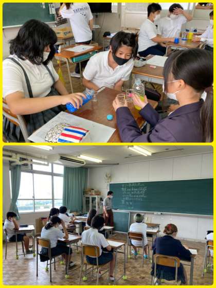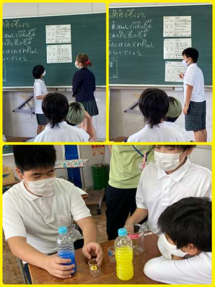6年生は算数で、同じ色の色水を複数人分作る場面を想定し、たくさん作るにはどうすればいいのか考えました。自分の考えを発表し、班で実際に混ぜてみて確かめました。