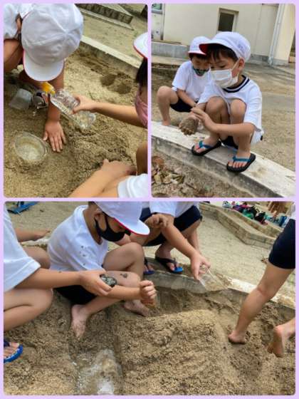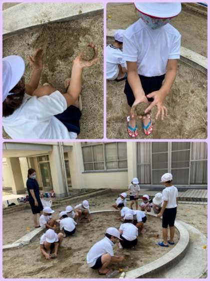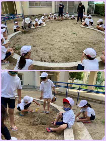 1年生は、中庭の砂場で水を使った遊びをしました。大きな山を作ったり、泥だんごを作ったり、みんなで楽しく活動できました。夏休みに、水を使った遊びをする際は、くれぐれも安全に気をつけてほしいと思います。