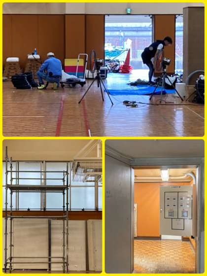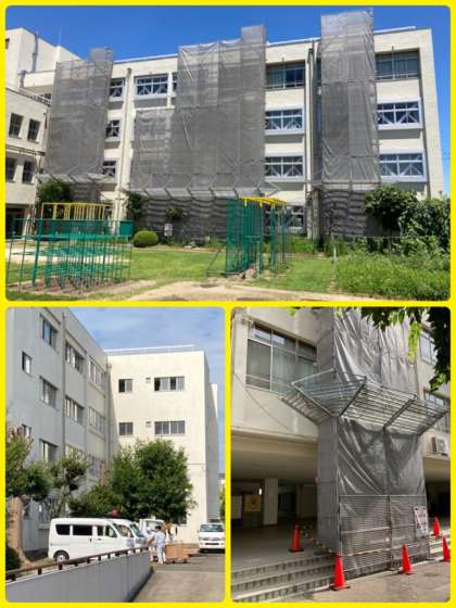 夏休みを利用して、現在、学校の内外で数か所の工事が行われています。外壁補修、エアコン更新設置工事、講堂舞台吊物装置交換、廊下ワックス塗布など、2学期以降に児童生徒が快適に活動できるように進められています。