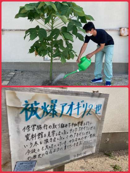 2年前に卒業した9年生が、広島の修学旅行でいただいたアオギリの苗が、とても大きくなっています。梅雨の時期を乗り越え、4月30日のお知らせのページでお伝えした時より、はるかに生長しました。