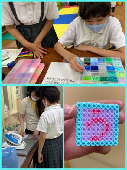 創作部は、アイロンビーズ、刺繍、アート絵画、小物作り等に取り組んでいます。小中学生みんなが何でも話しやすい雰囲気で、毎回楽しく活動しています。これからも、豊かな発想を活かせられる時間にしていきたいですね。