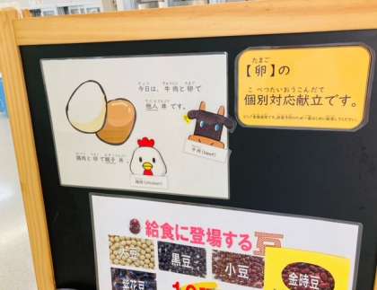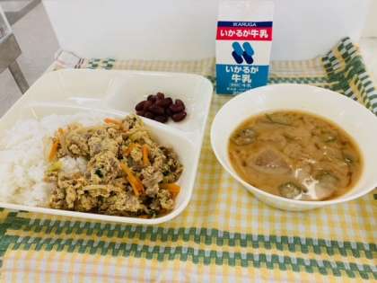 今日の献立は「他人丼、とうがんのみそ汁、金時豆の煮もの、牛乳」でした。他人丼は、【卵】の個別対応献立です。