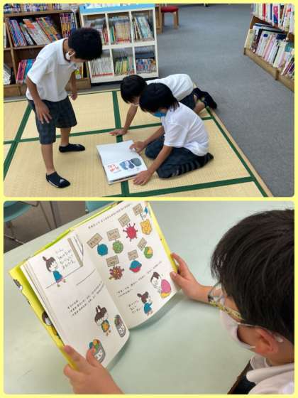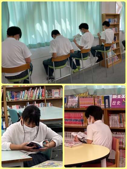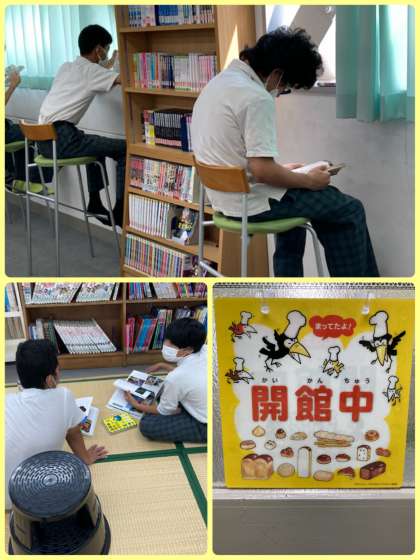 昼休みの図書室開放の様子です。小学生も中学生も、読みたい本を集中して読んでいます。新刊をふくめ、たくさんの種類の本がありますので、どんどん読みに来てほしいです。