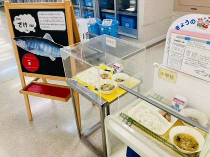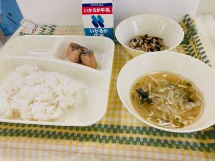今日の献立は「さけのしょうゆ風味焼き、五目汁、高野どうふのいり煮、ごはん、牛乳」でした。さけは、たんぱく質を多く含む赤のたべもののなかまです。さけの身には、たんぱく質のほかにビタミンB1、ビタミンB2、ビタミンDが含まれています。また、さけの脂肪には、DHAやEPAという成分が多く含まれていて、血液の流れをよくするはたらきがあります。