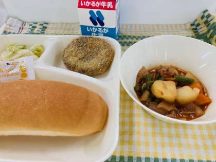 今日の献立は「チキンレバーカツ、ケチャップ煮、キャベツのバジル風味サラダ、コッペパン、マーマレード、牛乳」でした。チキンレバーカツには、鶏のレバーが入っています。カレー味にしているので、食べやすくなっています。
