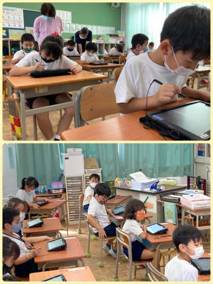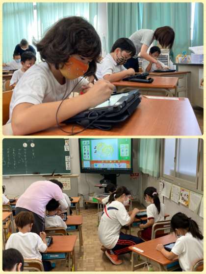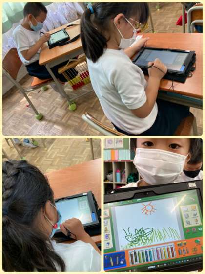 1年生は、1人1台のタブレット端末を使って、お絵かきをしました。動物、乗り物、くだものなど、それぞれが好きなものをタッチペンを使って描いていきました。上手に色もぬって、個性あふれるものをつくっています。また続きをしていきましょう。