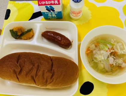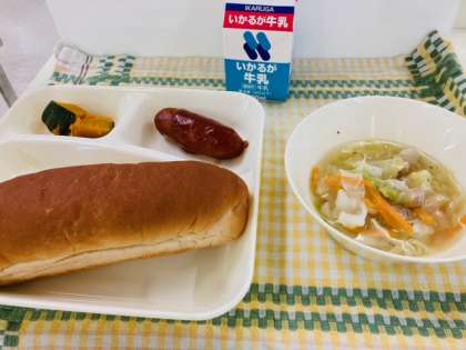 今日の献立は「フランクフルトのケチャップソース、スープ、焼きかぼちゃ、中学校:発酵乳、黒糖パン、牛乳」でした。フランクフルトは、豚肉、塩、香辛料などで作られるソーセージの一種です。ソーセージは太さによって呼び方がちがいます。