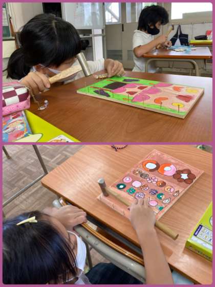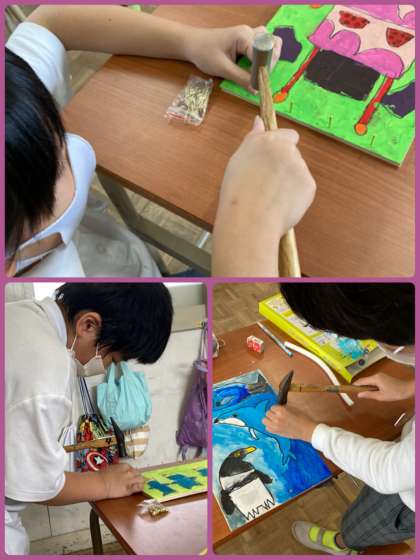 3年生は、金づちを使ってコリントゲームを作っています。背景も彩色して、みんなが楽しめる工夫やルールを考えながら制作を進めています。どんなオリジナルの作品が完成するか楽しみです。お家に持って帰った際は、ご家庭でも様々なルールで楽しんでみてください。