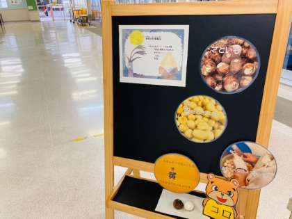 1年生の中には「さといもをはじめて見た。」という児童もいて、「松ぼっくりみたいかと思ったけど、全然ちがうな〜。」と可愛らしい気づきがありました。給食の食材に、秋のおとずれを感じます。
