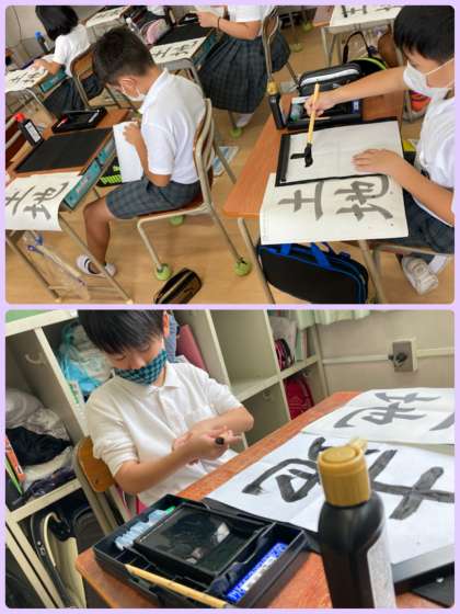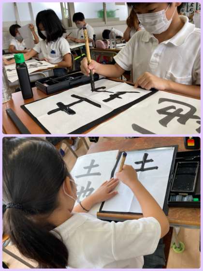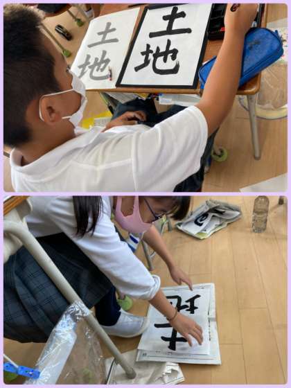 4年生は、書道の学習で「土地」の字を書きました。とめ、はね、はらいをしっかり意識して、集中して書いていきました。みんなとても上手に書けています。また掲示したものをお見せできる機会が来たら、見てあげてください。