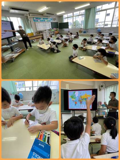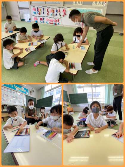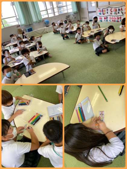1年生は外国語活動で、C−NETの先生と外国の文化について学んだあと、本のしおりを作りました。色えんぴつで丁寧にぬり、とても個性あふれる作品ができました。これからも、世界の様々な文化や言語にふれていきましょう。