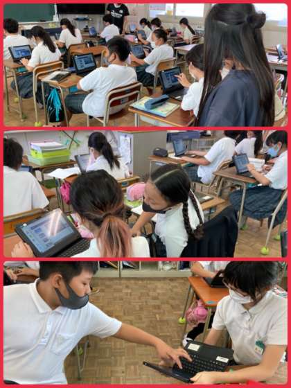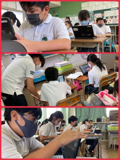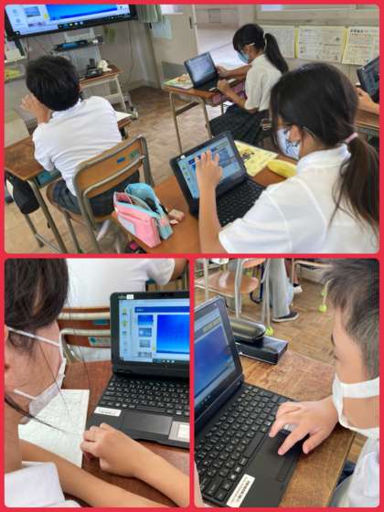 5年生は理科で、雲と天気の変化について学習しています。雲の割合で晴れの区分を見分けることを、タブレットの様々な画像を見て学習していきました。