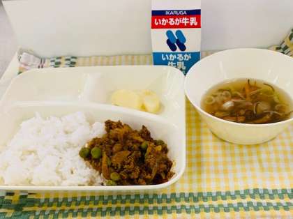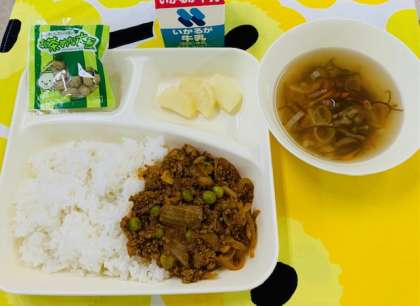 10/1(金)の献立は「タコライス、もずくのスープ、焼きじゃが、中学校:まっ茶大豆、牛乳」でした。タコライスはメキシコ料理のタコスの具をごはんにのせた沖縄県生まれの料理です。